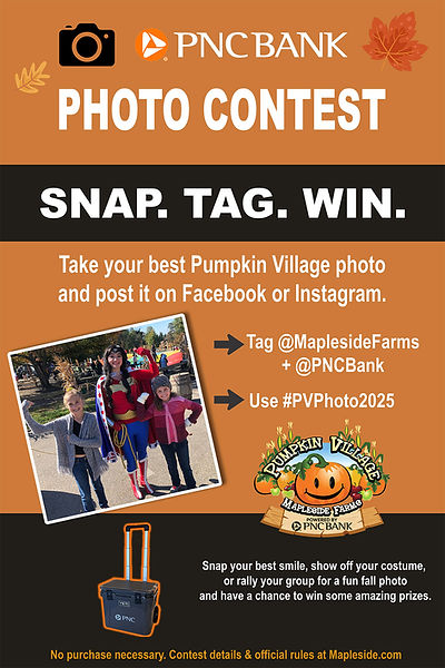 We’ve partnered with PNC Bank to bring you the Pumpkin Village Photo Contest. Simply snap your favorite moments here at Mapleside Farms — whether it’s your best smile, a standout costume, or a fun family shot — and share it on Facebook or Instagram.